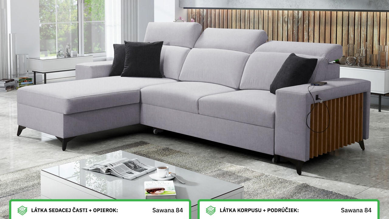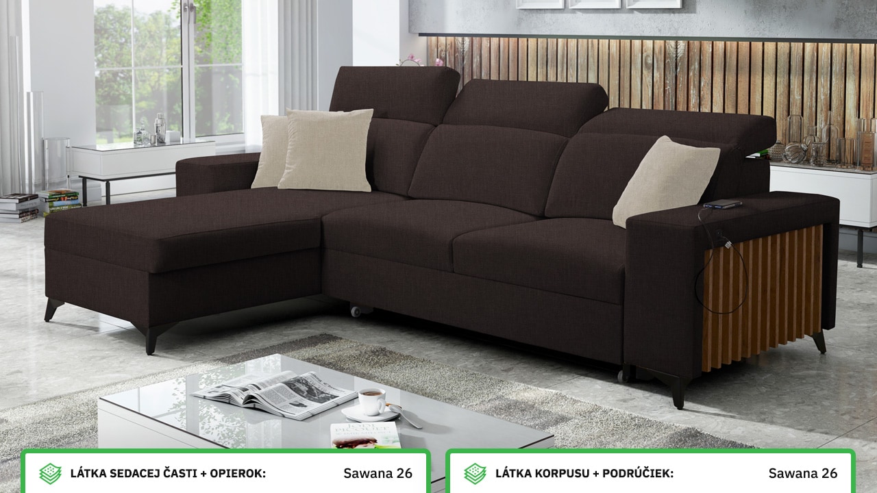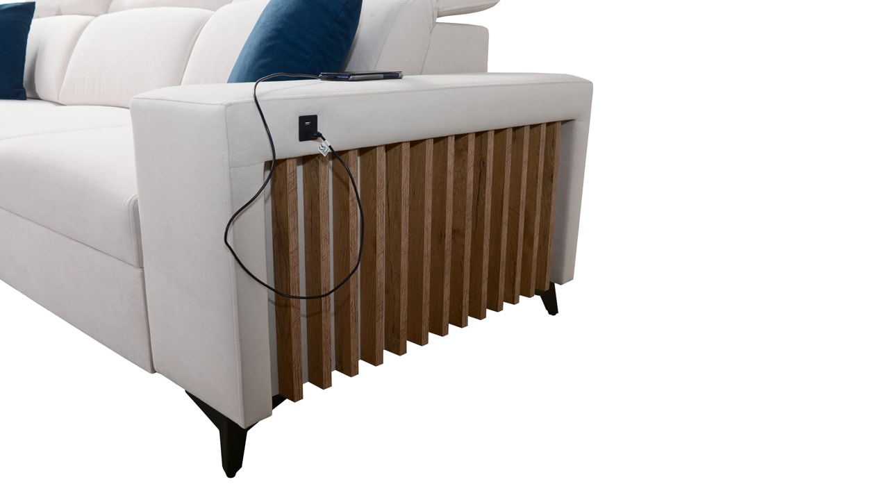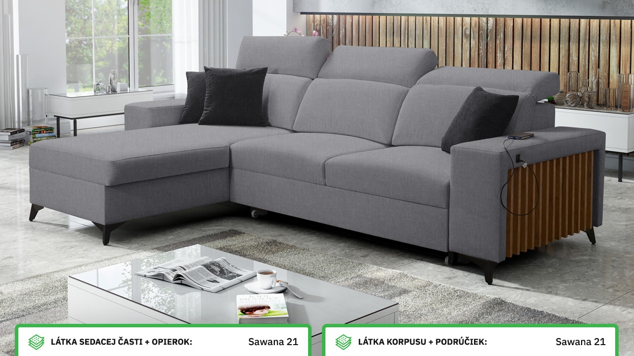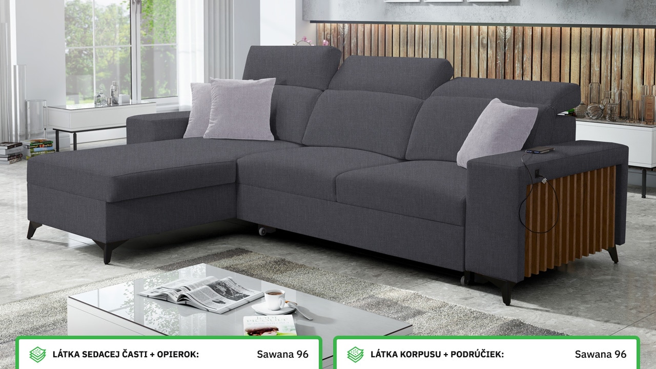 Menšia rohová sedačka, ktorá ale určite splní vaše očakávania. Spája v sebe moderný dizajn, kvalitu výroby, praktické funkcie aj pohodlie pri sedení. Z dizajnového hľadiska je doplnená o zaujímavý drevený detail, ktorý z nej robí mimoriadne štýlový kúsok. Kvalitu zase zaručia pevné a odolné materiály, vďaka čomu sedačka ostáva dlhé roky ako nová. K vášmu pohodliu poslúžia polohovateľné opierky hlavy a komfortný sed. Na záver určite oceníte aj veľký úložný priestor, možnosť rozkladania a vstavanú nabíjaciu stanicu.