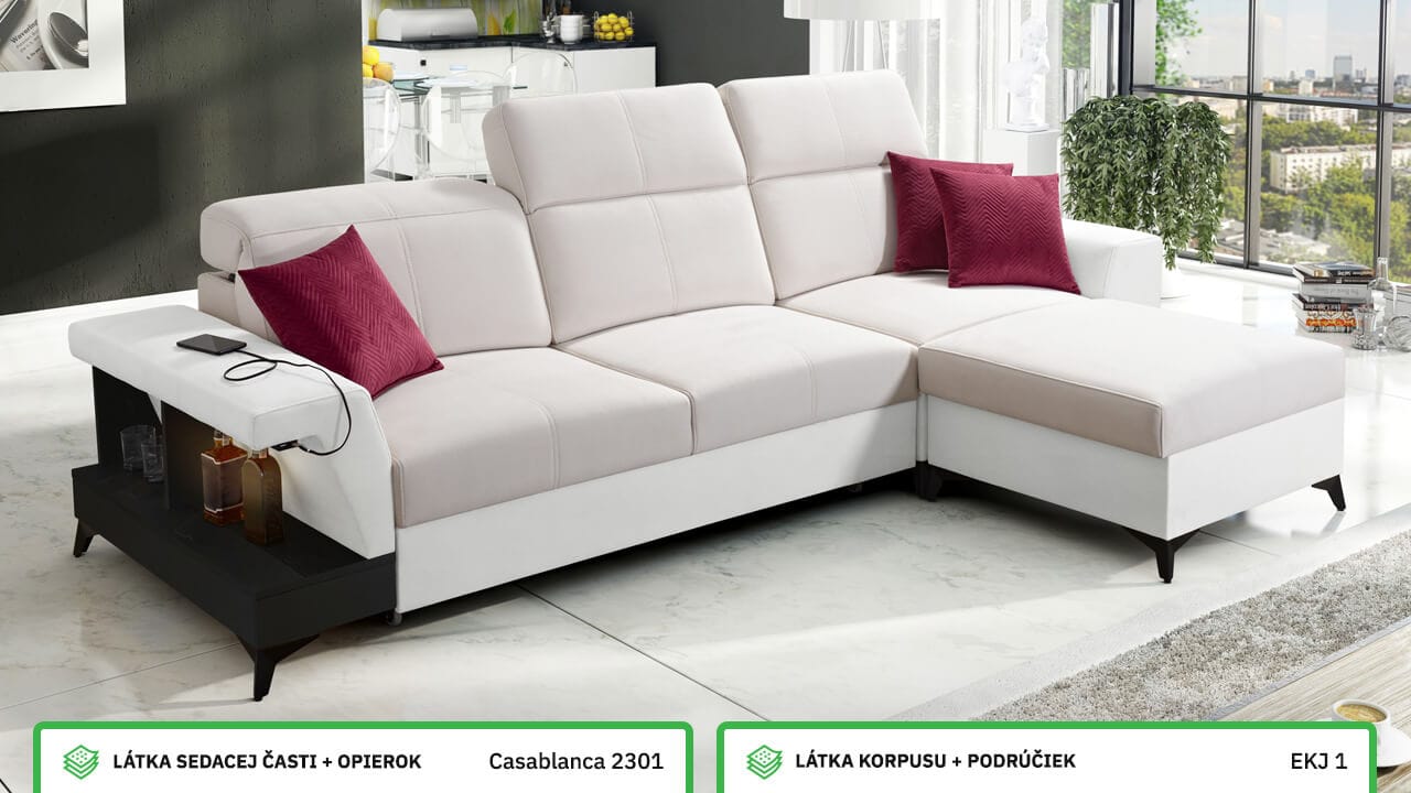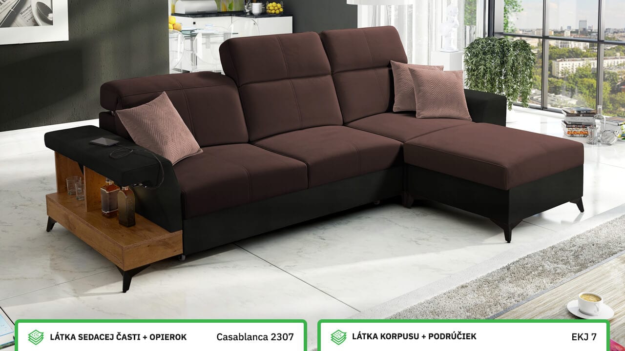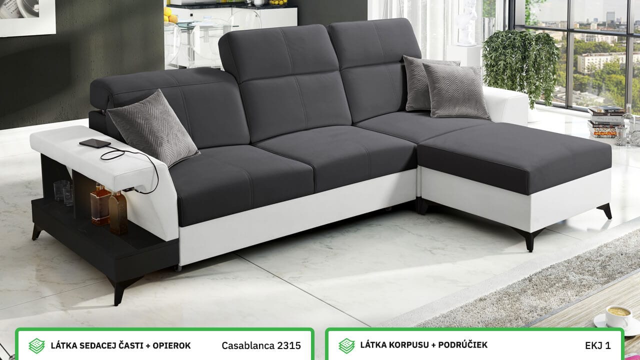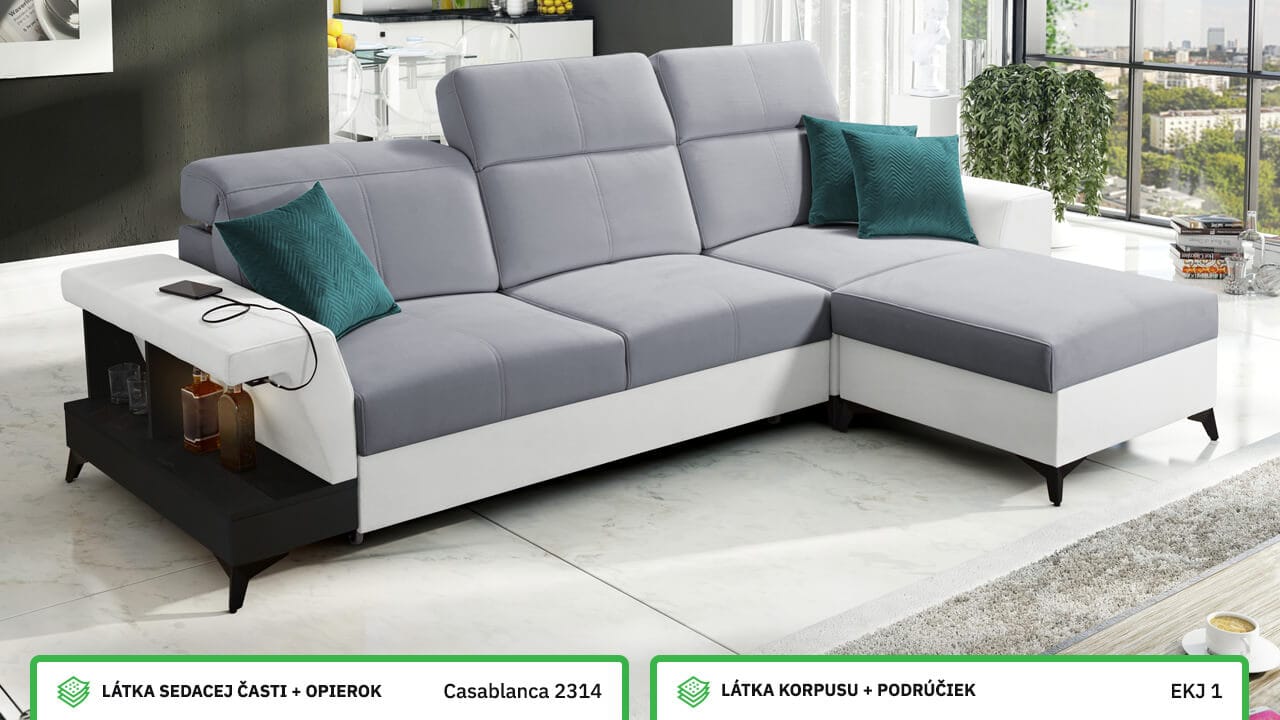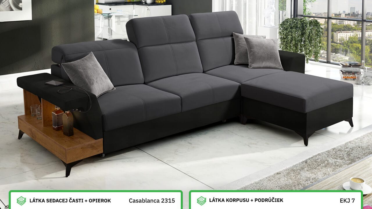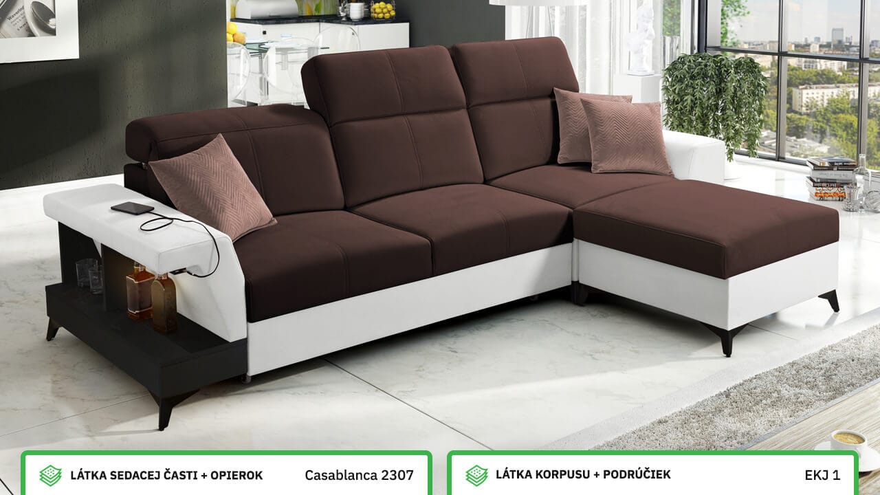 Kvalitná rohová sedačka so zaujímavým praktickým aj dizajnovým prvkom vstavaného minibaru. Je vybavená polohovateľnými opierkami hlavy, možnosťou rozloženia, úložným priestorom a USB portami na nabíjanie. Aj napriek jej menším rozmerom vám poskytne maximálne pohodlie. Hodí sa do menších obývačiek či panelákových bytov. Prejdite na konfigurátor a vyberte si ju vo farbe a poťahu podľa vlastných preferencií.
