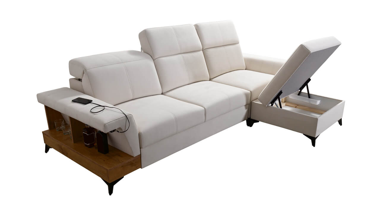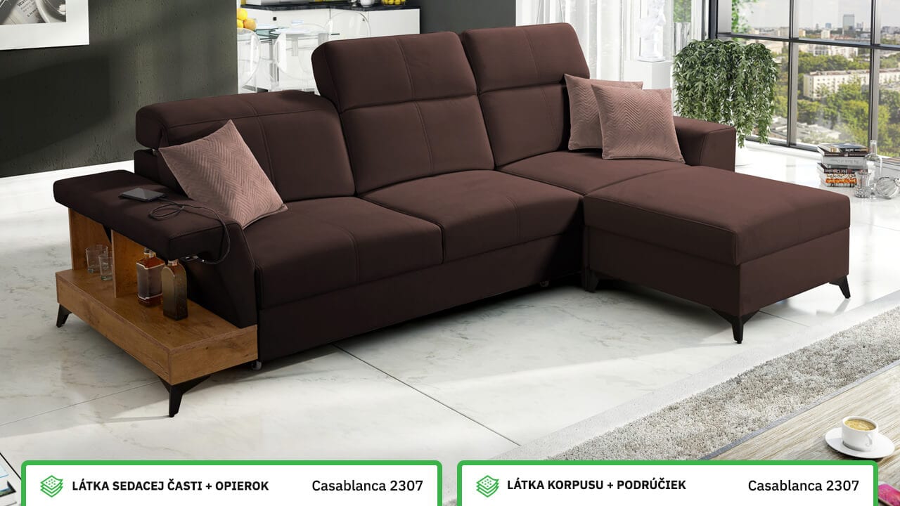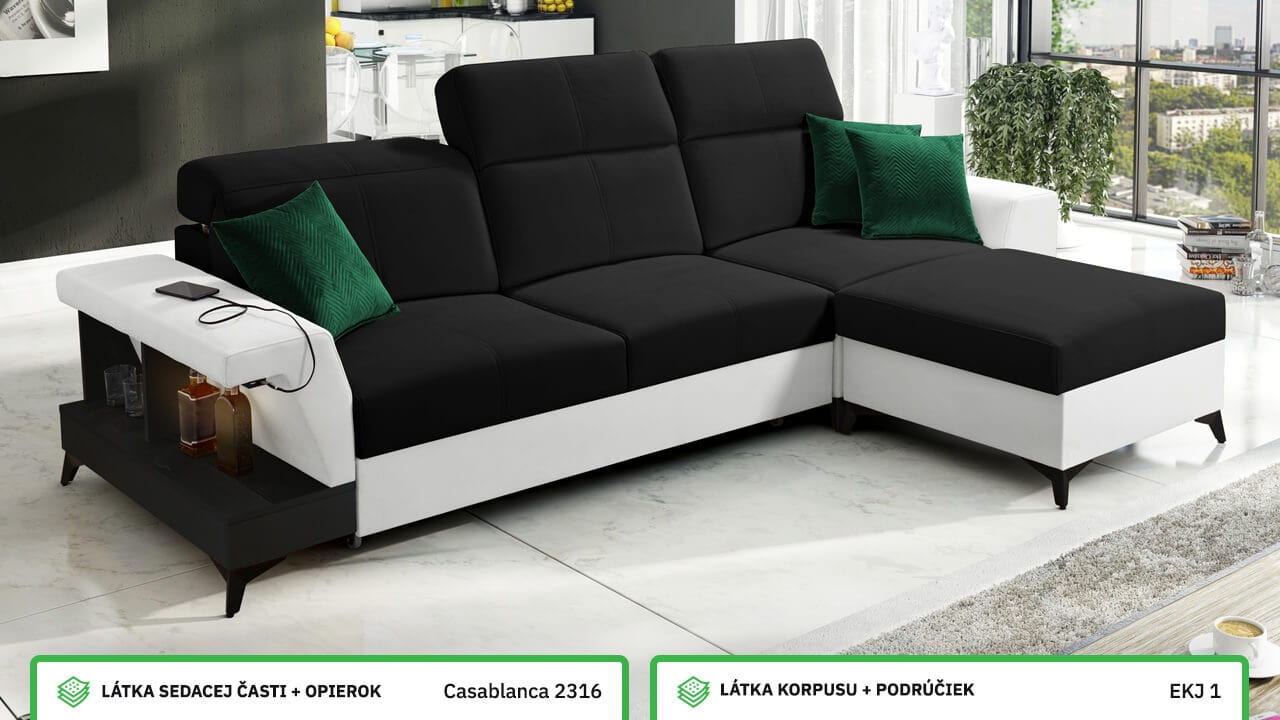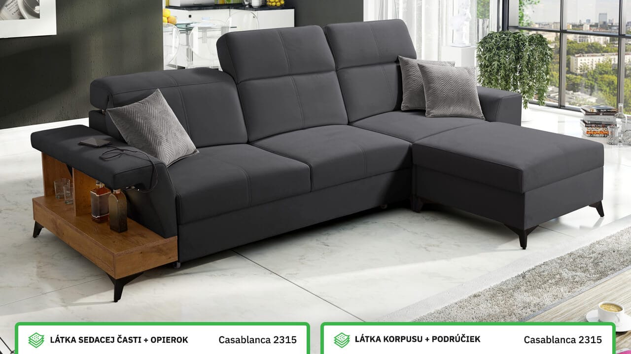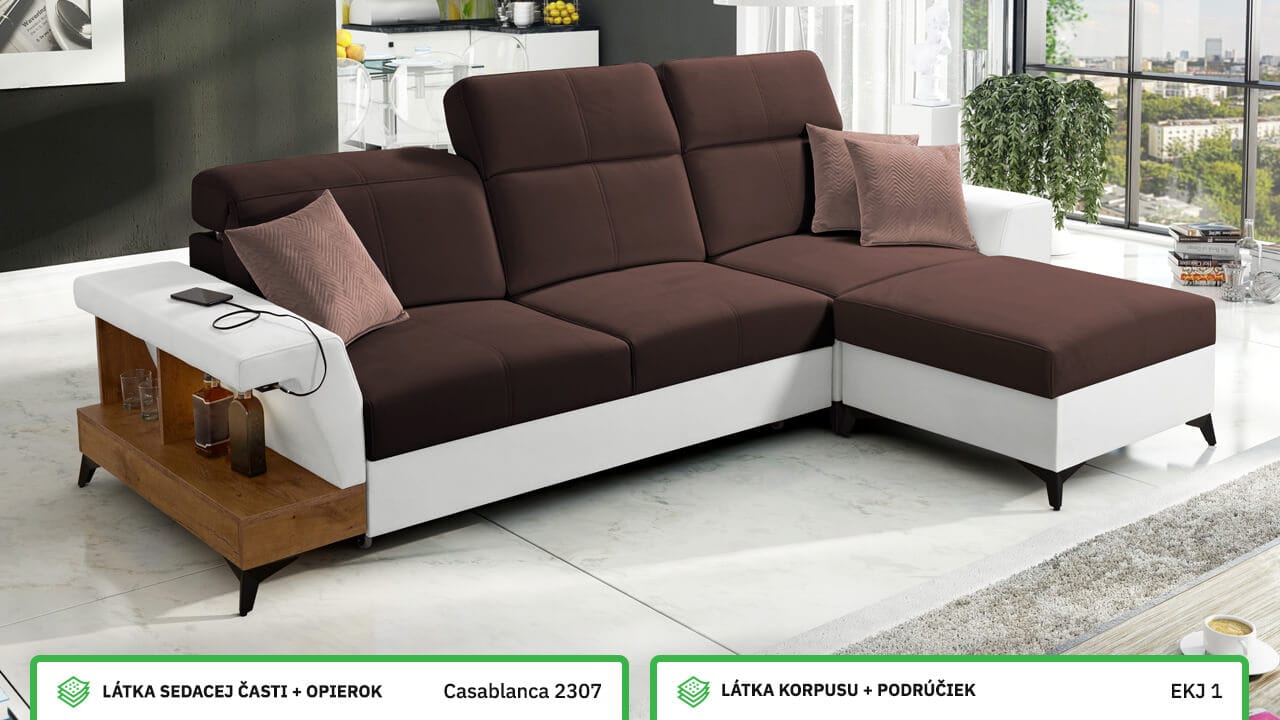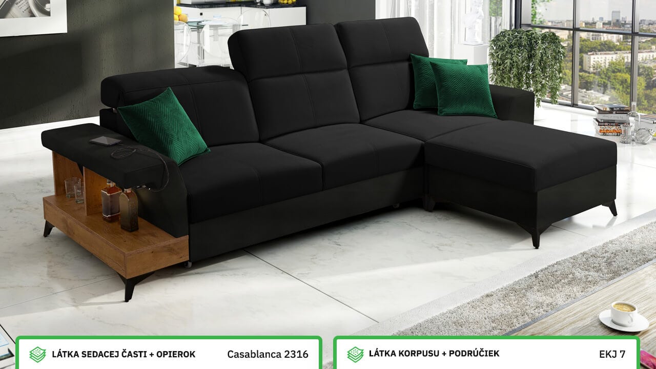 Kvalitná rohová sedačka so zaujímavým praktickým aj dizajnovým prvkom vstavaného minibaru. Je vybavená polohovateľnými opierkami hlavy, možnosťou rozloženia, úložným priestorom a USB portami na nabíjanie. Aj napriek jej menším rozmerom vám poskytne maximálne pohodlie. Hodí sa do menších obývačiek či panelákových bytov. Prejdite na konfigurátor a vyberte si ju vo farbe a poťahu podľa vlastných preferencií.