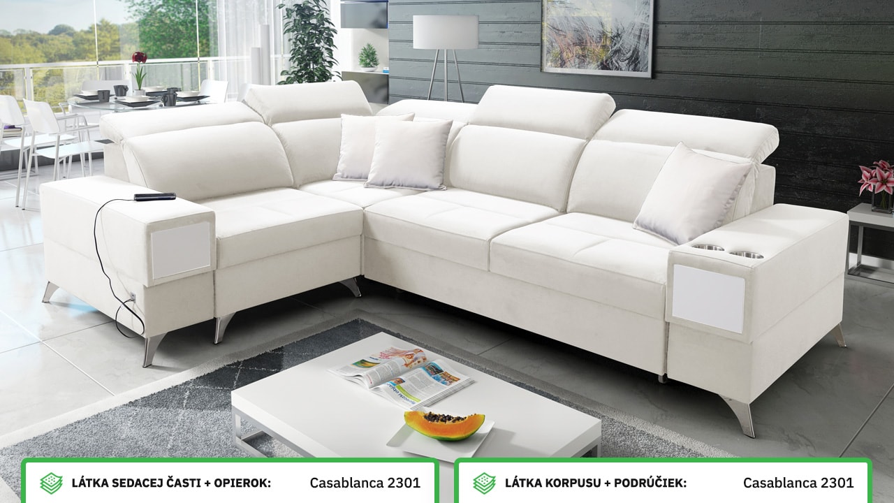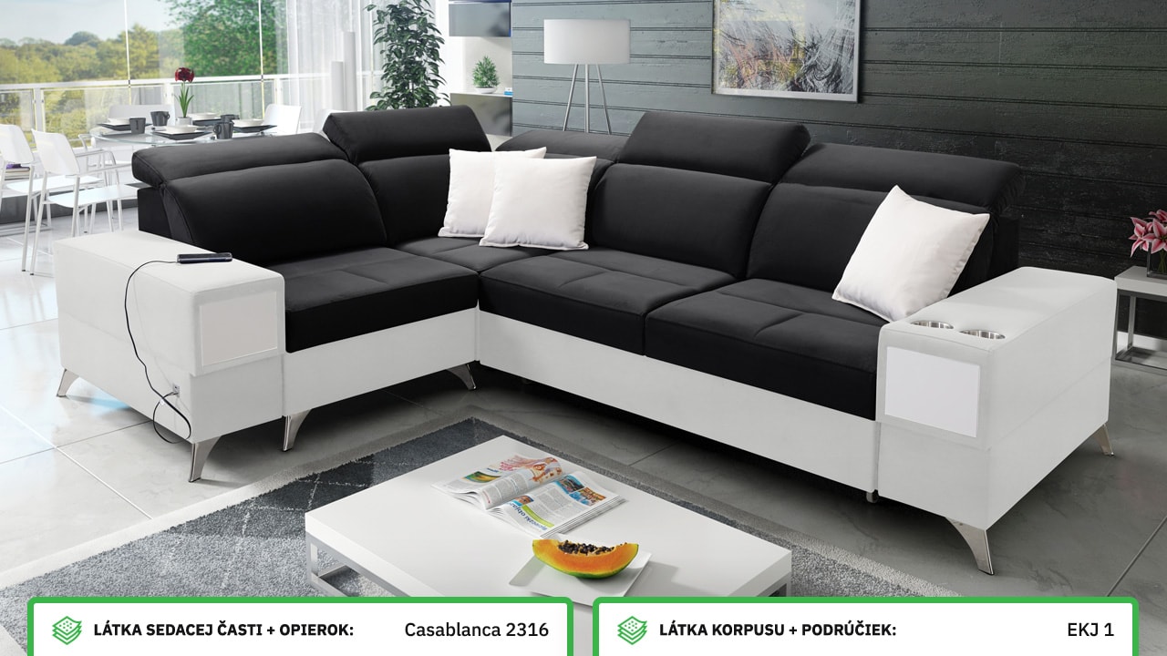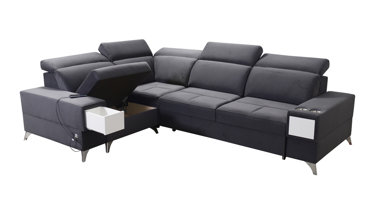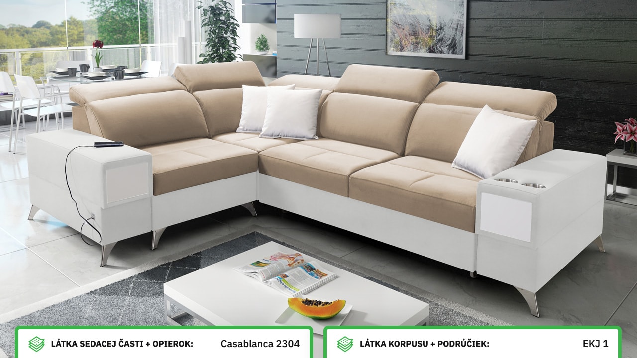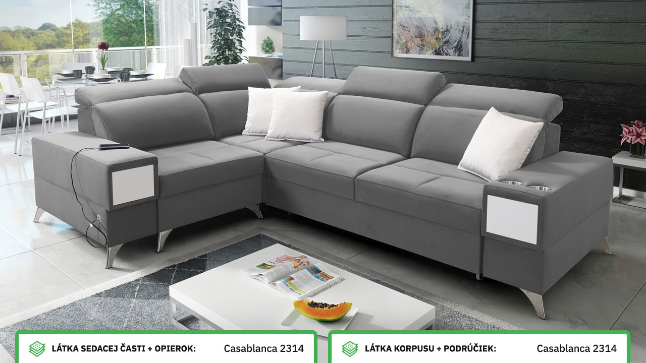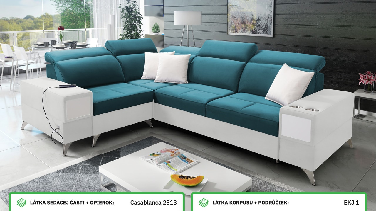 S touto praktickou rohovou sedačkou hravo vyčaríte pohodlné sedenie v obývačke, detskej izbe aj v kancelárii. Jej prednosťou je úložný priestor a vstavaný šuplík, umiestnený v bočnej opierke. Výhodou sú tiež držiaky na poháre, nastaviteľné opierky hlavy a USB porty určené na nabíjanie mobilu. Dizajn sedačky si do veľkej miery môžete prispôsobiť vašim predstavám. V našom konfigurátore si totiž sami nakombinujete farbu poťahu, typ nožičiek aj dizajn šuplíka.