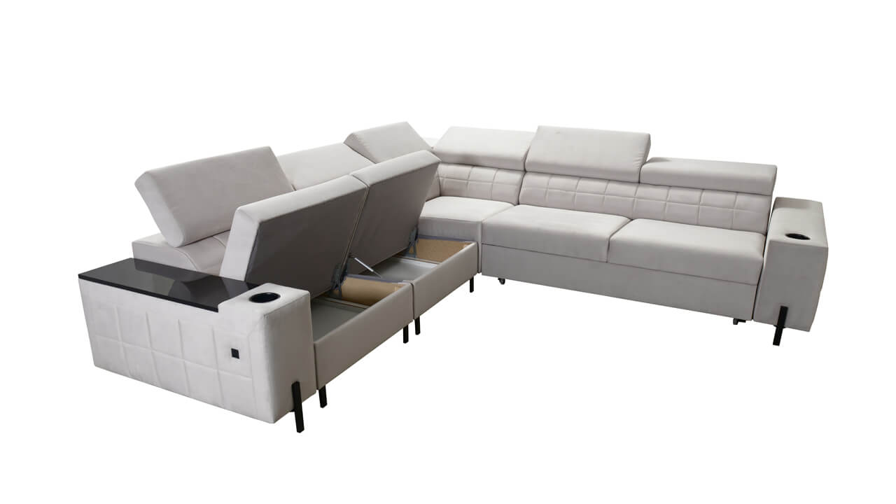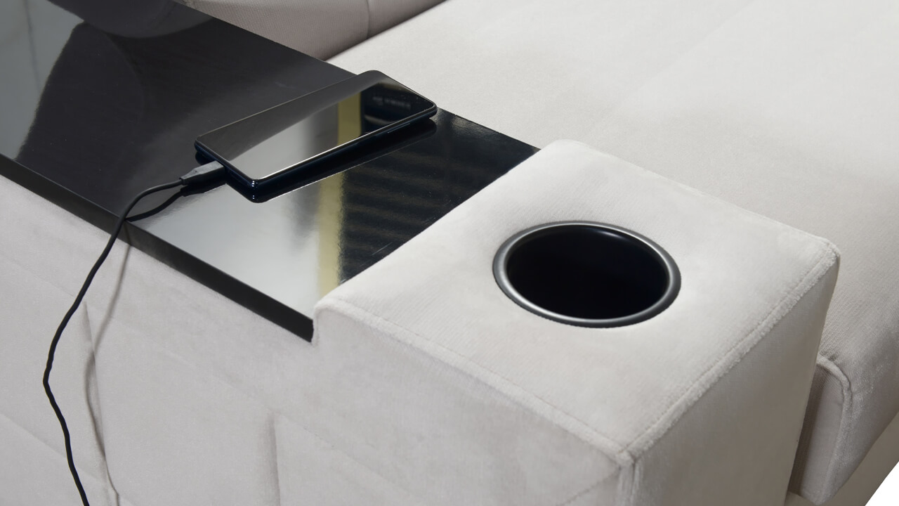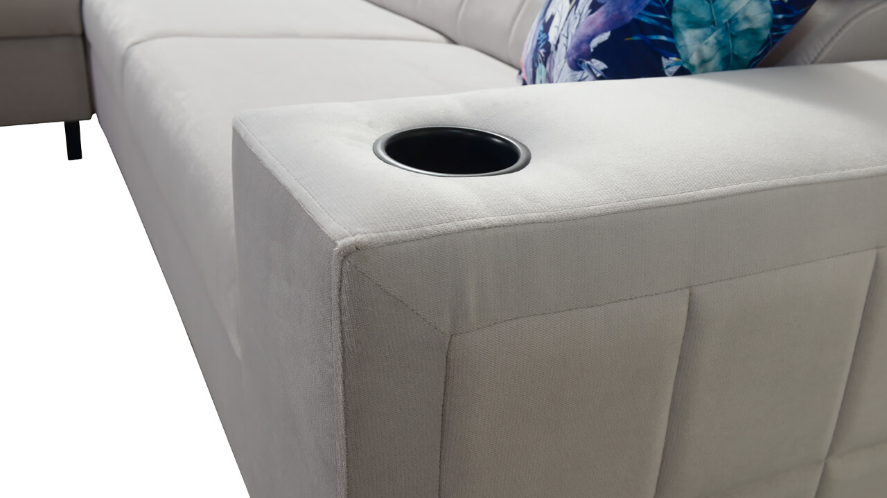 Pri leňošení na rohovej sedačke GABIIO IV budete mať všetko potrebné vždy po ruke: pohár s drinkom si môžete odložiť do držiaku na poháre, po obľúbené maškrty sa stačí načiahnuť do vstavaného minibaru a vybitý mobil môžete pohodlne zapojiť do zabudovaného USB portu. Páčil by sa vám takýto komfort? Vylepšia ho aj nastaviteľné opierky hlavy a možnosť rozloženia pre príležitostné spanie či polihovanie po náročnom dni.