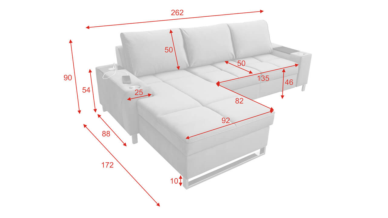 Výnimočná rohová sedačka Hermos I sa hodí najmä do menších obývačiek. Vďaka svojim prepracovaným bočným opierkam vám ponúkne vstavané držiaky na poháre, minibar a nabíjaciu stanicu na USB. Pod celým jej kratším krídlom sa nachádza praktický úložný priestor. Po rozložení vám poskytne komfortný priestor na príležitostné spanie.