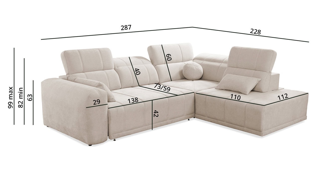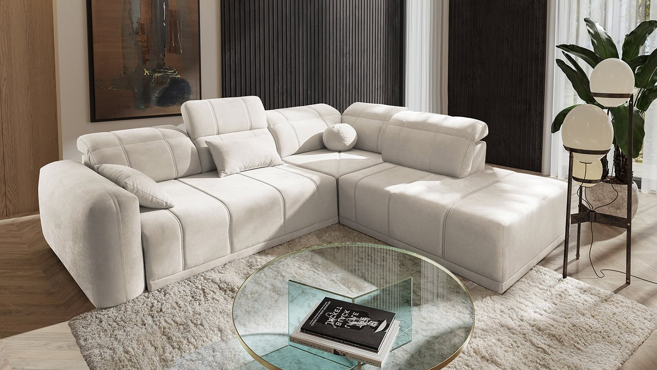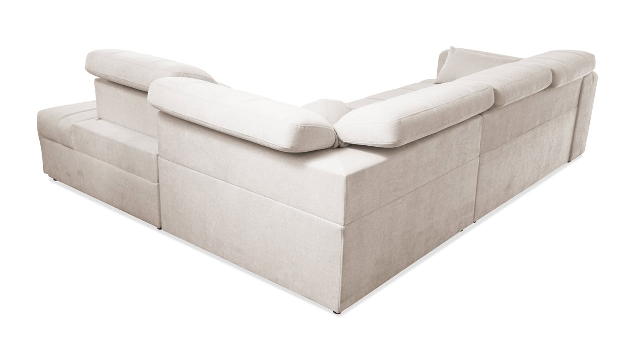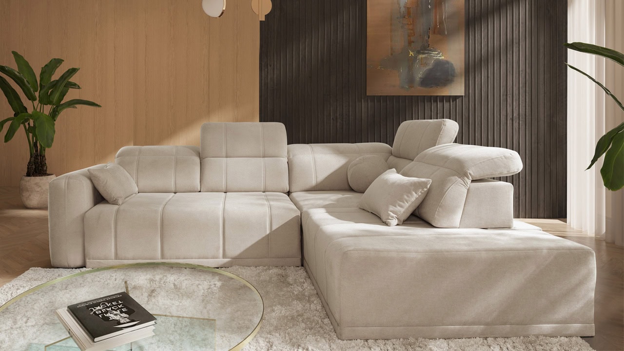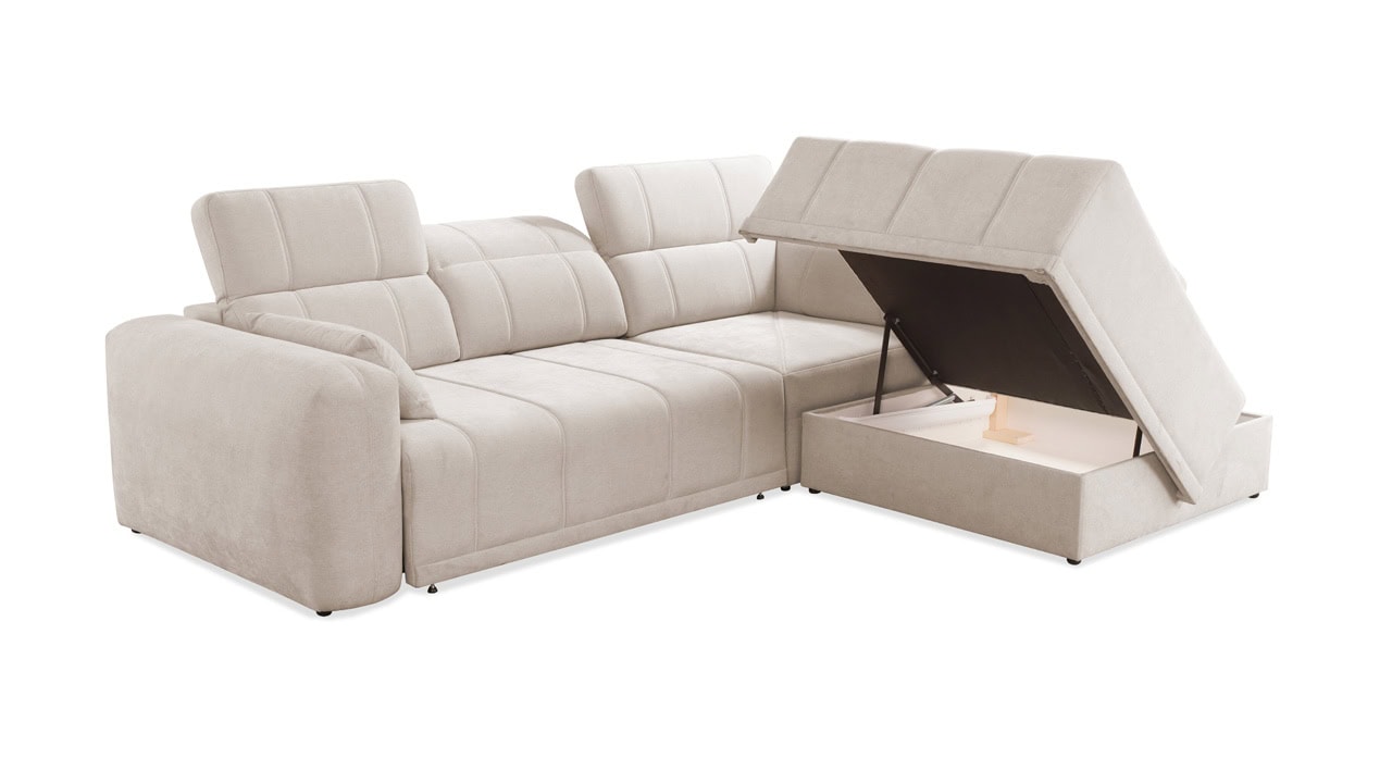 Hľadáte štýlovú a praktickú sedaciu súpravu v tvare L? Táto rohová sedačka s možnosťou výberu poťahového materiálu a úložným priestorom splní všetky vaše požiadavky. Kvalitná konštrukcia, moderný dizajn bez nožičiek a zaujímavý detail šitia robia z tejto sedačky nadčasový kus nábytku. Vďaka nastaviteľným opierkam hlavy a posúvateľnej chrbtovej opierke povyšuje komfort na novú úroveň.