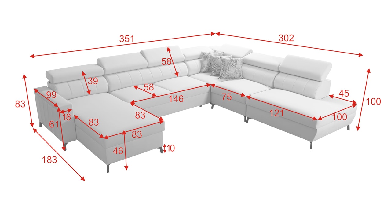 Veľká sedačka v tvare U, ktorá pohodlne usadí celú vašu rodinu alebo väčšiu návštevu. Je vyrobená z pevnej konštrukcie, takže zvládne aj vyššie váhy a časté používanie. K vášmu dokonalému pohodliu poslúžia nastaviteľné opierky hlavy a komfortné sedenie. Určite vás poteší aj naozaj veľký úložný priestor rozdelený až do troch samostatných sekcií.
