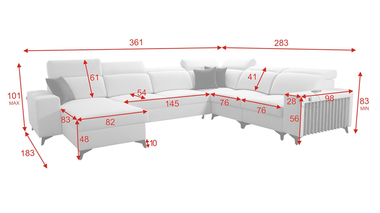 Veľká, priestranná a pohodlná sedacia súprava v tvare U poskytne maximálne pohodlie celej vašej rodine. Komfort umocňujú nastaviteľné opierky hlavy, ktoré sú ideálnou voľbou pre každého, koho bolieva chrbtica. Sedačku si navyše môžete vybrať v akomkoľvek poťahovom materiáli z nášho vzorkovníka a k nemu nakombinovať dizajn dreveného prvku v piatich farbách. Ľahko ju teda zladíte s akýmkoľvek nábytkom.