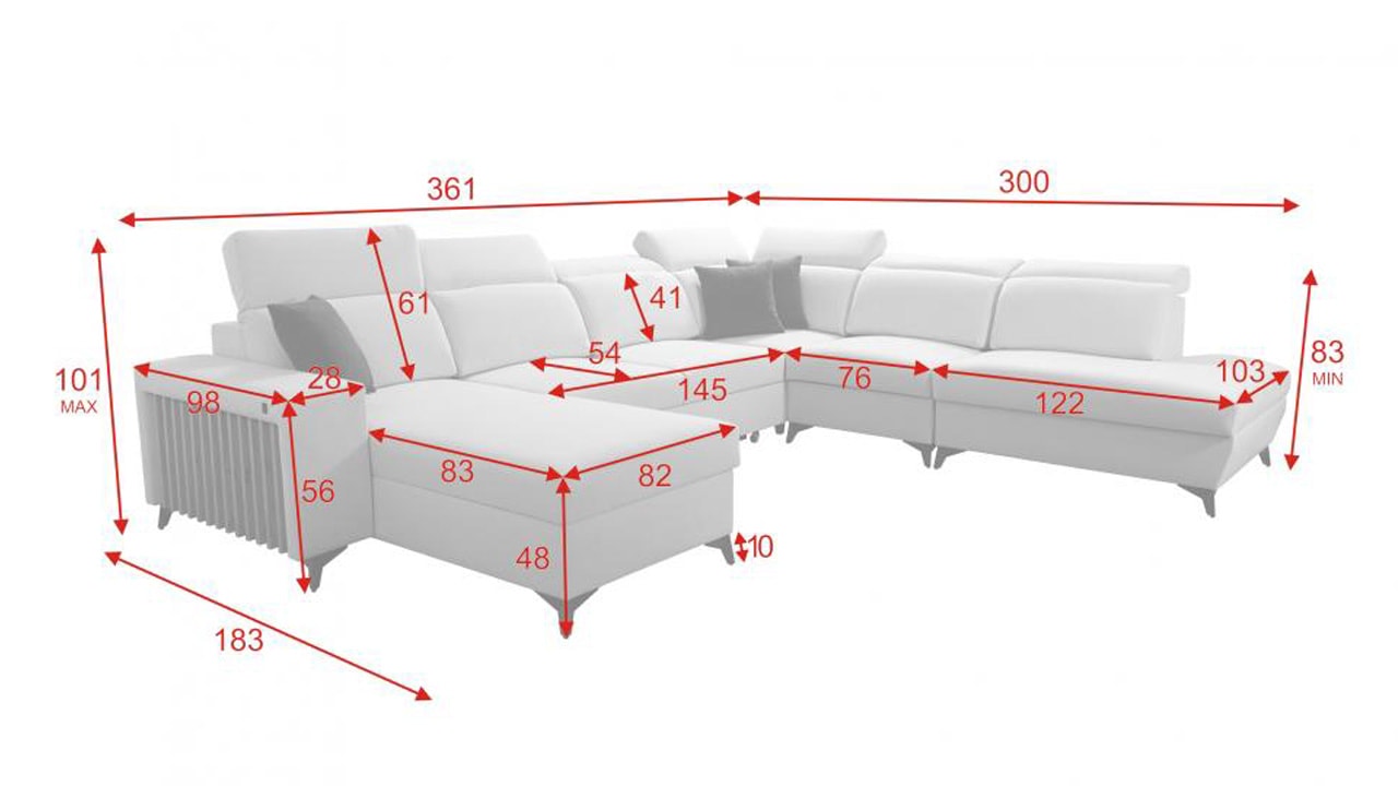 Jedna z najväčších U sedacích súprav v našej ponuke. Pohodlne usadí minimálne 6 ľudí, no a pri večernom relaxe si na nej komfortne poleňoší 4-členná rodina. Je vybavená polohovateľnými opierkami hlavy a USB portami na nabíjanie. Objednať si ju môžete v rôznych farebných prevedeniach. Inšpirujte sa našimi vizualizáciami alebo si vyberte sami podľa vášho vkusu zo vzorkovníka materiálov. Drevený detail je tiež možné farebne prispôsobiť.