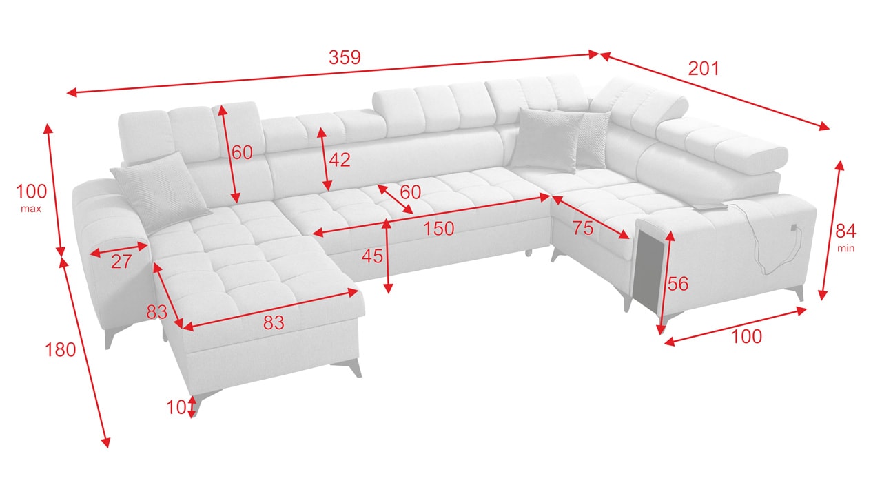 Táto sedacia súprava do tvaru U prinesie do vášho domova spojenie funkčnosti, pohodlia a luxusu. Úložný priestor udrží váš domov uprataný, zatiaľ čo vstavaná nabíjacia stanica zabezpečí, že budete vždy online. S polohovateľnými opierkami hlavy si môžete prispôsobiť sedenie podľa pohodlia, no a vďaka vstavanému minibaru budete mať vždy všetko po ruke. Sedačku vám vyrobíme v akomkoľvek poťahu, okrem látok Erie, Bristol a Bahama.