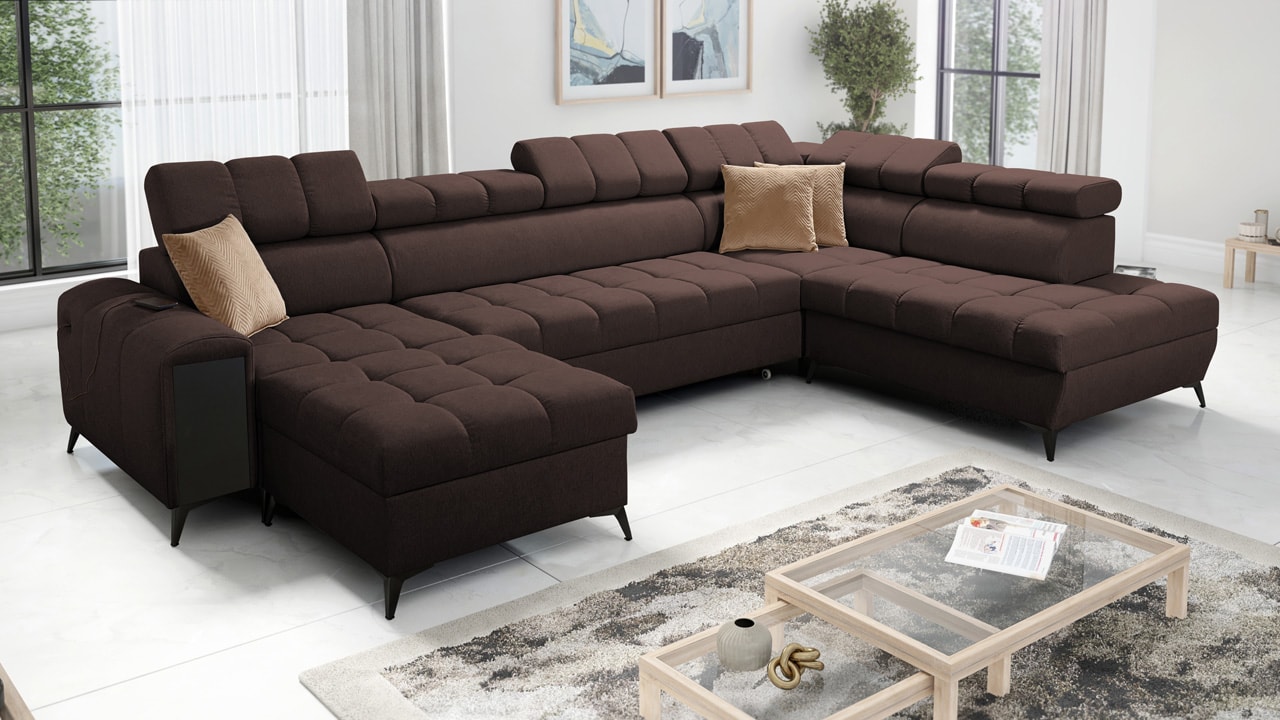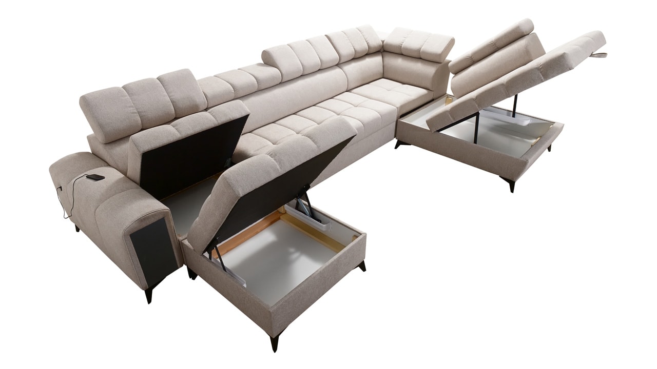 Táto moderná rohová sedacia súprava je navrhnutá tak, aby vám domov priniesla maximálnu pohodu a využitie priestoru. S polohovateľnými opierkami hlavy sa môžete pohodlne usadiť a relaxovať. Úložný priestor vám umožní efektívne využiť každý centimeter vašej obývačky.  Vstavaný minibar zase zaistí, že budete mať všetko po ruke. Čerešničkou je už len fakt, že si sedačku môžete nechať vyrobiť v poťahu podľa vášho vkusu, okrem látok Erie, Bristol a Bahama.