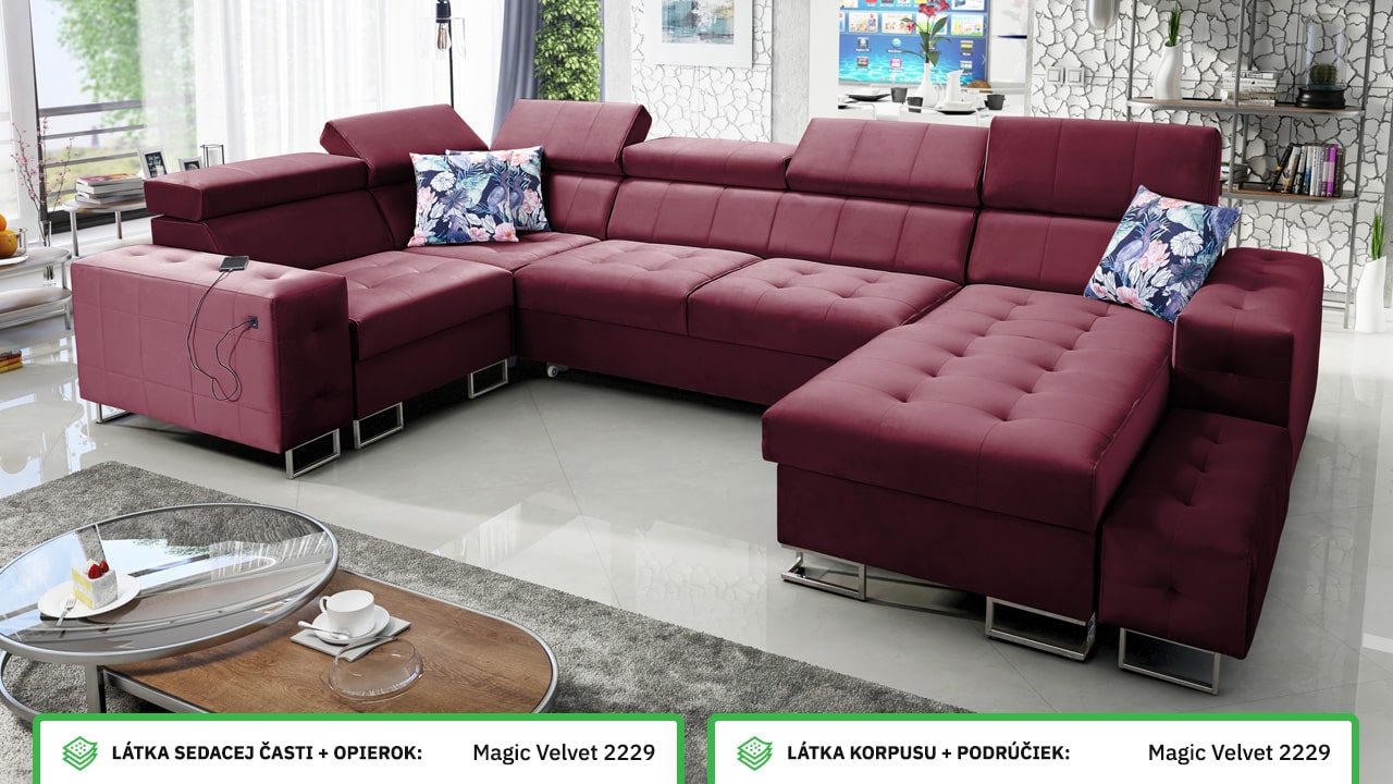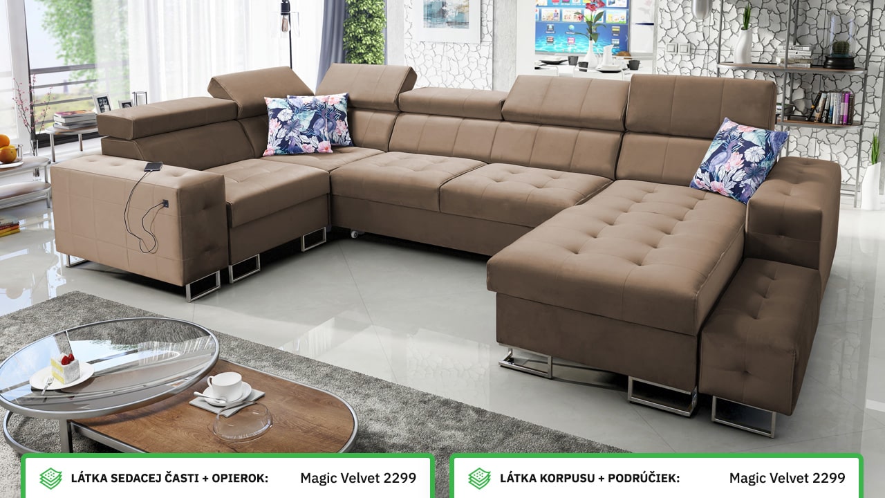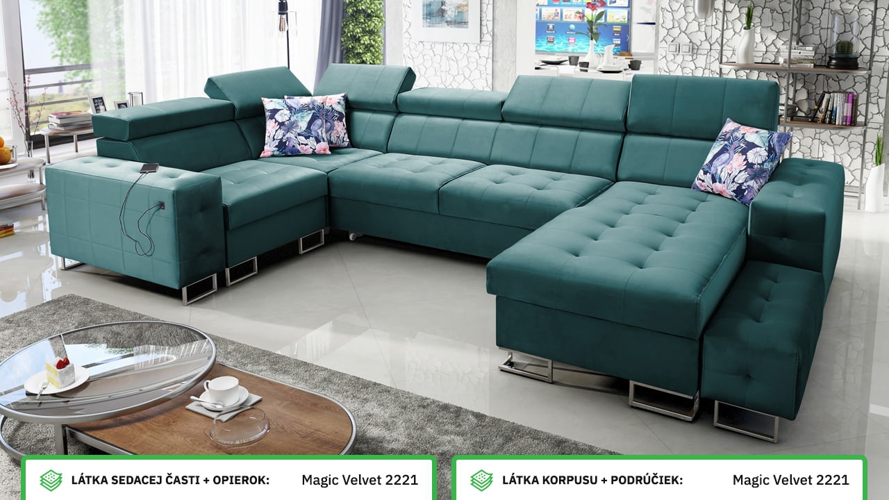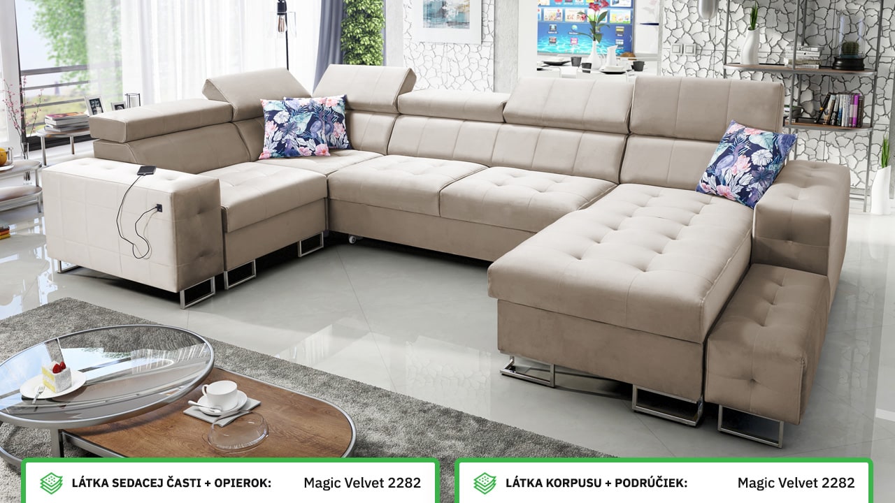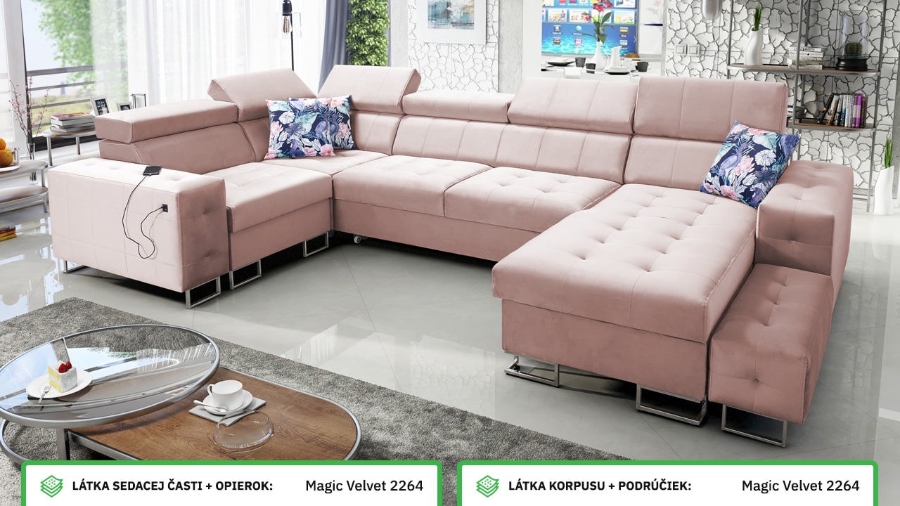 Kvalita, pohodlie aj štýl – táto sedačka do tvaru U vyniká vo všetkých aspektoch. Jej precízne vyhotovená konštrukcia zaručuje vysokú kvalitu a odolnosť, čo z nej robí dlhodobú investíciu. Sedenie je pevné a pohodlné, maximálny komfort dotvoria polohovateľné opierky hlavy. Výhodou je aj možnosť rozloženia, úložný priestor, vstavaný USB port a taburet zdarma. Na sedačku si môžete sami vybrať poťah a farbu podľa vášho vkusu.