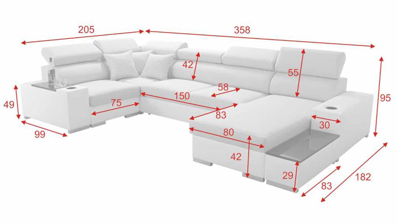 Exkluzívna sedačka v tvare U so zabudovaným barom v bočnej opierke. Lesklá doska slúži ako malý pultík a v každej podrúčke je navyše vstavaný držiak na pohár. Farbu dosky, držiakov, typ nožičiek a poťahovej látky si môžete nakombinovať podľa seba.
