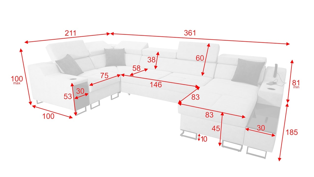 Veľká, pohodlná, rodinná sedačka, ktorá sa zapáči každému členovi vašej domácnosti. Je veľmi priestranná, preto si na nej pohodlne oddýchnete a zrelaxujete. Pre vaše pohodlie má priamo v opierkach zabudovaný minibar, držiaky na poháre, USB nabíjačku, malú lampu a odkladací stolík. Samozrejmosťou je možnosť rozloženia a veľký úložný priestor.